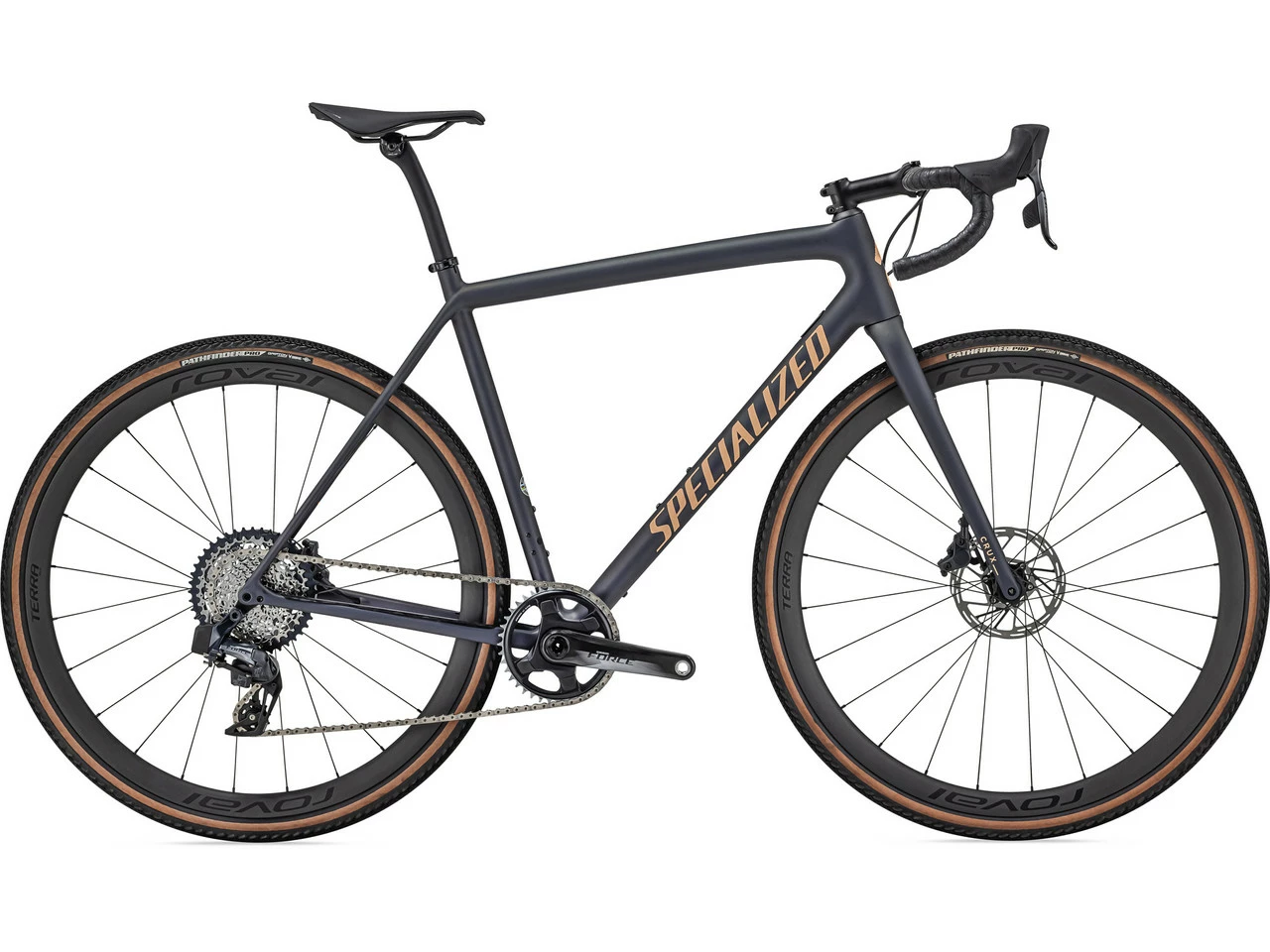 La Specialized Crux Pro para carreras de Gravel y de Ciclocrós, así como para recorridos de aventura más cortos, se basa en un cuadro de carbono excepcionalmente ligero y viene con grupo de cambios electrónico SRAM Force de 1×12 velocidades. Equipada con frenos de disco Force, ruedas de carbono Roval Terra CL, manillar de carbono y tija de sillín de carbono. Para la construcción, los ingenieros adoptaron el diseño tubular del Aethos, lo que explica su sensacional peso. En relación con esto, la Crux también establece nuevos estándares en términos de holgura de cubiertas: es posible montar fácilmente cubiertas de 47 mm de ancho de 28″ o cubiertas de 2,1″ de ancho de 650B. En comparación con la Diverge, la geometría, con un Reach mayor, un Stack más bajo y un eje de pedalier más alto, está diseñada para una posición de conducción más deportiva y garantiza agilidad, maniobrabilidad y capacidad de respuesta particulares. Gracias a su aspecto purista y clásico, la Crux recuerda ciertamente a una bicicleta de ruta, a lo que también contribuye el hecho de que prescinda de la tecnología Future Shock y SWAT. Con este corredor todoterreno orientado al rendimiento, subes las colinas sin peso y vuelas sobre los baches como si nada.