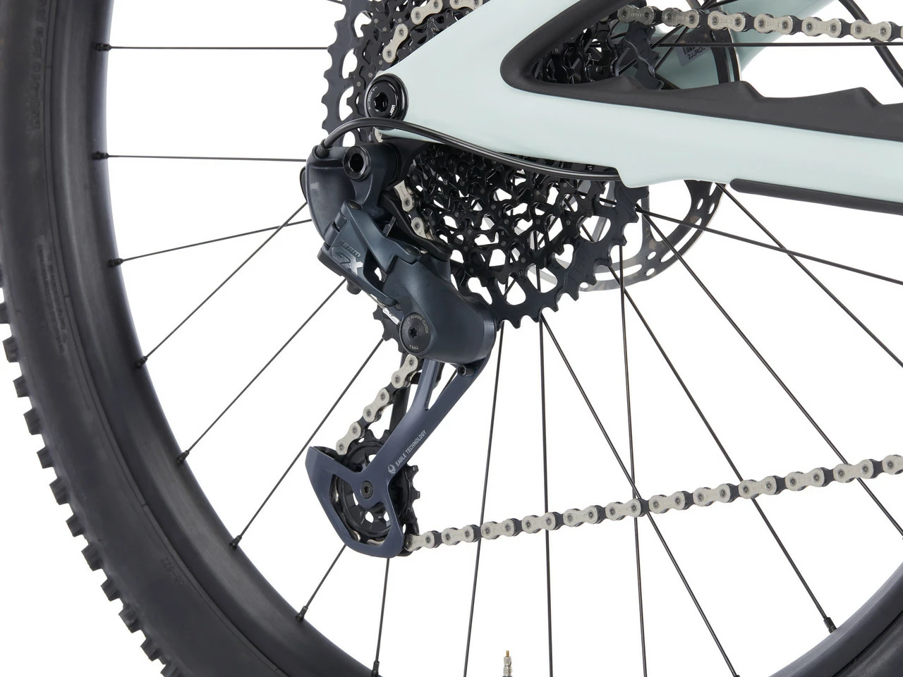 El diseño patentado Switch Infinity se caracteriza por el llamativo elemento de enlace en el punto de giro principal, que permite tanto el movimiento radial como el axial. Al principio del recorrido de muelle, el punto de giro se mueve hacia arriba para que el triángulo trasero pueda esquivar incluso los obstáculos más difíciles de los senderos. Esta posición contrarresta los efectos de la propulsión y permite que tu bici vuele literalmente cuesta arriba. Sin embargo, si la bici se encuentra más abajo en el recorrido de muelle, el Switch Infinity Link baja de nuevo, dándote la sensación de un recorrido de muelle sin fin con el que desea conquistar cualquier sendero.